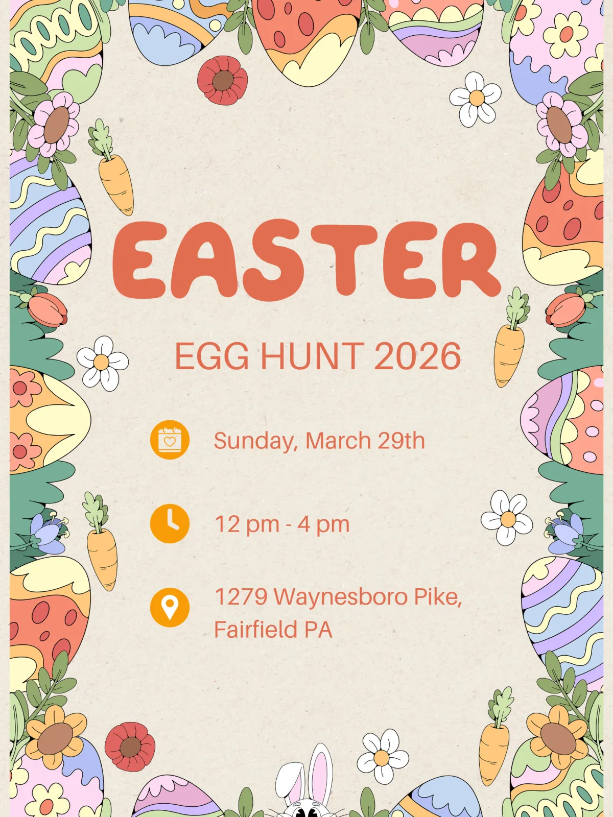 Our personal favorite part of the day! Expect at least 500 eggs, stuffed and ready to go. Please don't forget your baskets! We'll have a few extra in case. We also recommend bringing a pair of old shoes for the kids. We've done a lot of dirt work this winter and with all the rain we expect to have some muddy areas of the yard.